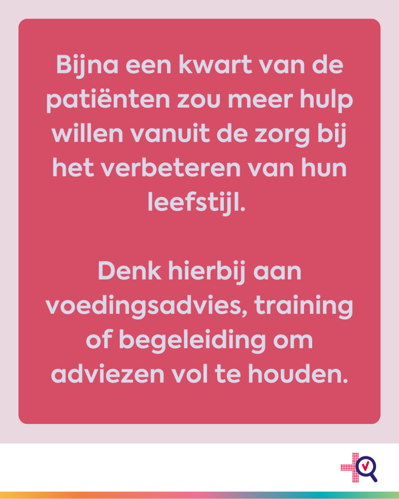 Bijna een kwart van de deelnemers zou meer hulp willen vanuit de zorg bij het verbeteren van hun leefstijl, zoals voedingsadvies, training of begeleiding om adviezen vol te houden.